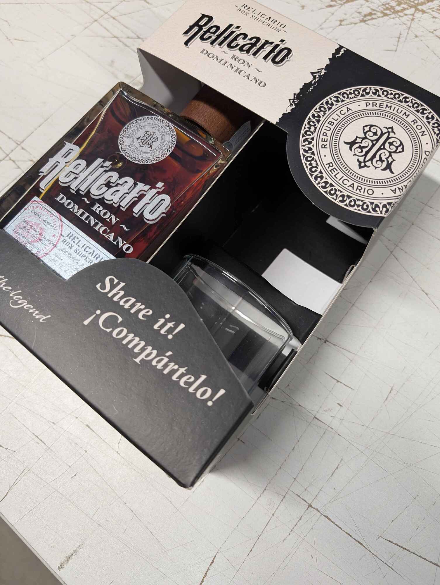 Ron Relicario je rum s plnou chuťou. Nos pošteklia jemné tóny vanilky a sviežeho ovocia. Na jazyku jasne pocítite, že je to dozretý a dobre rozvinutý rum, jemne sladký s drevnatými tónmi, vanilkou a opečenými mandľami. Extravagantná láska k detailu a fľaša s ťažkým skleneným dnom takisto jasne ukazuje silu rumu Ron Relicario, exkluzívneho rumu z Dominikánskej republiky. Balenie obsahuje Relicario Ron Dominicano Superior 0,7 l a dva poháre.