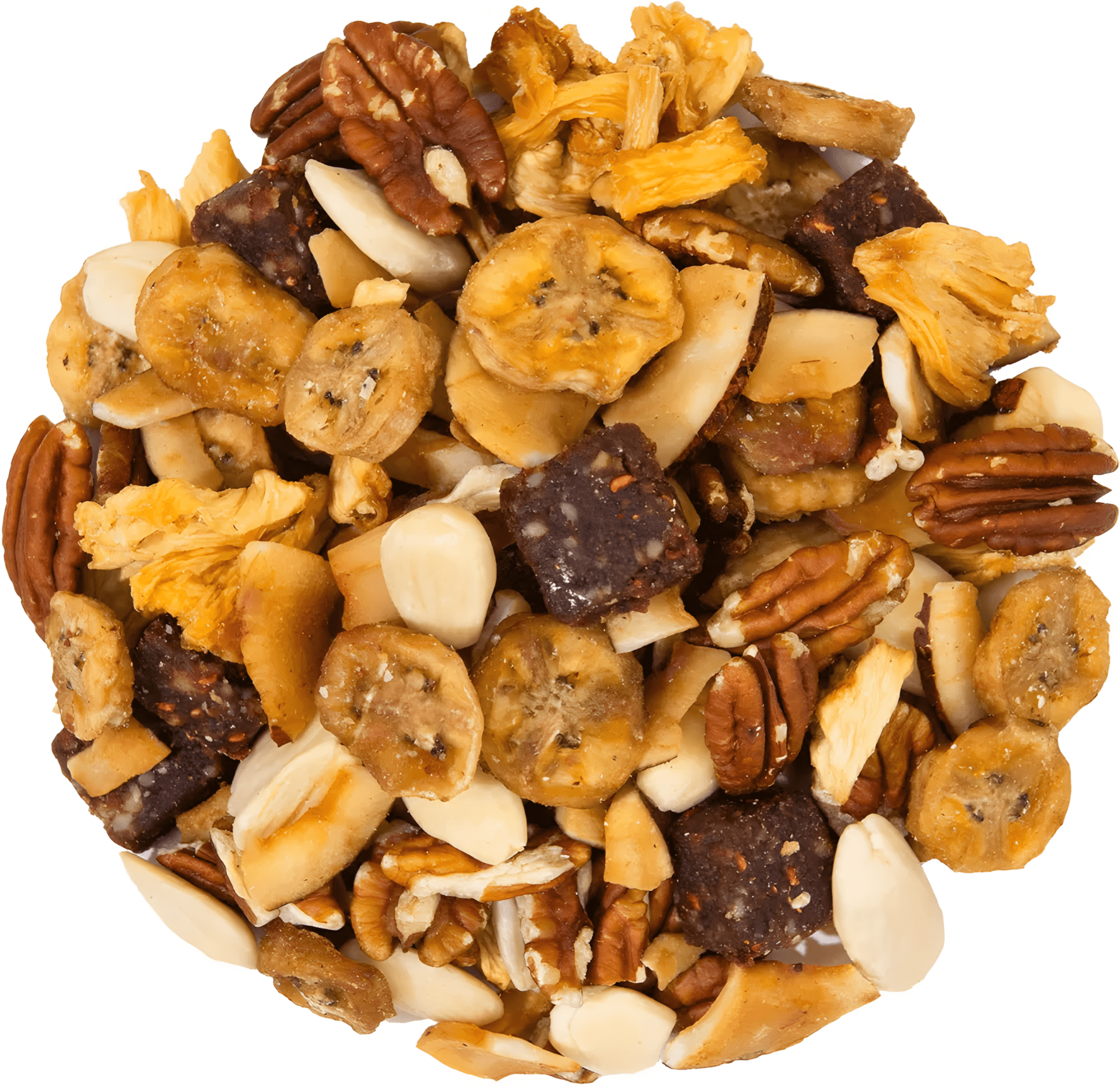 Zmes obsahuje banánové sušené kolieska, malinové kúsočky, pekanové orechy, lúpané mandle, kokosové chipsy s nektárom a kúsky sušeného ananásu. Vďaka tejto kombinácii ponúka vyvážený pomer prírodných cukrov, zdravých tukov a vlákniny, ktoré pomáhajú udržať energiu počas dňa.